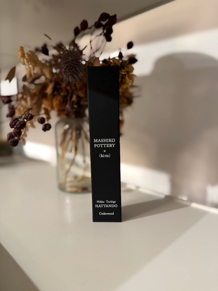 For this Mashiko London Fair, each piece comes with an exclusive collaborative incense created by Hattando, a traditional incense maker from Nikko, Tochigi. This special (ki:ts) × Hattando x Mashiko Pottery incense is crafted from Nikko cedar and features a gentle, calming cedar aroma unique to the region.